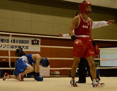 | フライ級決勝でRSC勝ちの林田㊨ |