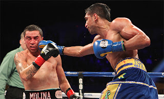 L・ピーターソン、ダニー・ガルシアに連敗中のカーンは負けが許されない一戦。広いスタンスからスピードを生かしたボクシングでポイントを積み重ねる。3回に左目をカットしたモリナは以後、消極的になり、カーンはサークリングしながらパンチを散らし自在にコントロール。傷が悪化したモリナはラウンドを追うごとに劣勢に陥り、10回が終わるとセコンドが棄権を申し入れた。カーンはこの勝利で空位のWBC・S・ライト級シルバー王座を手にしている。