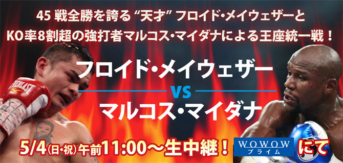 4月12日に挙行されたパッキャオvsブラッドリーⅡに続き、5月3日米ラスベガスMGMグランドで行われるビッグマッチ、フロイド・メイウェザーvsマルコス・マイダナの特設ページを開設しました。