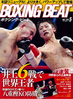 ボクシングビート5月号が15日発売となりました。表紙は井上尚弥がプロ6戦目の世界奪取最短記録を打ち立てたアドリアン・エルナンデス戦。井上の右アッパーが見事にさく裂した瞬間をとらえています。この井上戦と同じリングで行われた八重樫東の防衛戦、そして河野公平の世界返り咲き戦をカラーリポートしています。