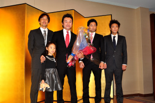今後は関西でジム経営を計画しており、テレビの解説にも意欲的。会見後には後輩王者の山中慎介と五十嵐俊幸から花束を贈られ、愛する家族と写真に納まった。