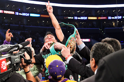 また1年ぶりのリングとなった元WBO・J・ミドル級暫定王者アルフレド“ペロ”アングロ(メキシコ)は左一撃でラウル・カサレス(米)を初回56秒KO。不法滞在で7ヵ月間収監されたアングロはリング復帰に涙を浮かべた。Photo/GBP