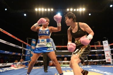 セミファイナルで行われた女子10回戦ではWBCシルバー・フライ級チャンピオン、ジェシカ“キカ”チャベス(メキシコ)が元世界王者の天海ツナミ(アルファ)に3-0判定勝ち。スコアは97-95、97-93、97-94でチャベス。善戦したツナミだが、これがメキシコでの6度目の黒星となった。Photos/Pepe Rodriguez