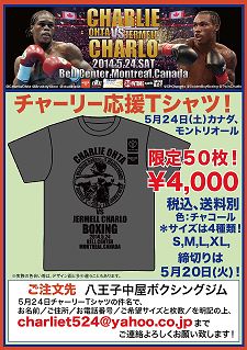 ■八王子中屋ジムが5月24日にカナダ・モントリオールで米国期待のジャーメル・チャーロと対戦するチャーリー太田の応援Tシャツを限定50枚で発売。試合はS・ウェルター級12回戦で何らかのタイトルがかけられる模様。購入方法など詳しくはホームページで。http://8box.blog.shinobi.jp/Entry/2104/