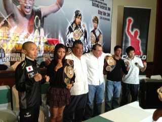 6日(日本時間7日)にメキシコ・テピクで開催されるWBAダブルタイトル戦の記者会見が3日、現地で行われた。会見にはWBAミニマム級1位で暫定王者のヘスス・シルベストレ(メキシコ)と同級8位三田村拓也(ワールドスポーツ)、そしてWBA女子バンタム級王者ジャネット・ペレス(メキシコ)と前S・フライ級王者天海ツナミ(アルファ)の出場選手が出席。めいめいが必勝を誓った=上写真=。