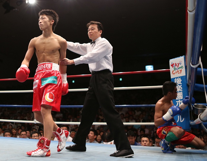 井上は初回、右ボディストレートを効かせてると、ジャブを有効に使い、時にカウンターも決めて試合を優位に進めた。途中やや雑になる場面も見られたが、4回に強烈な左ボディブローを打ち込んでオマヤオにテンカウントを聞かせた。
