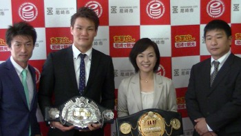 野中(中央左)とベルトを手にする稲村市長■8月10日住吉区民センターで日本S・ウェルター級タイトルマッチに挑む元2冠王者の野中悠樹(渥美)が5日、大東旭会長代行らと地元尼崎市の稲村和美市長を表敬訪問した。チャンピオン細川貴之(六島)と対戦する野中は王座奪取を約束。稲村市長から激励を受けた。