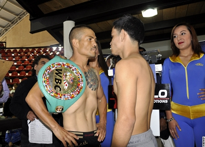 中国で熊朝忠をストップして戴冠したWBC世界ミニマム級王者オスワルド“ガジート”ノボア(メキシコ)が28日(日本時間29日)挑戦者アルシデス“カスコ”マルティネス(ニカラグア)を相手にV1戦のリングに立つ。27日に行われた計量でノボア(13勝8KO4敗1分)、マルティネス(12勝6KO2敗8分)とも47.6キロでクリアした。 ノボア(左)とマルティネスのフェイスオフ