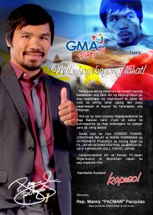 なおこの日比対決に対しフィリピンの英雄マニー・パッキアオがビデオによるメッセージを寄せている(写真は当日のプログラムから)。試合当日の会場で公開されるが、You-Tube でも下記のアドレスで見られる(http://dl.dropbox.com/u/60578431/movie_rev2.wmv)