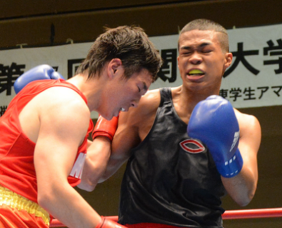 アマチュアの第67回関東大学ボクシングリーグ戦は12日後楽園ホールで最終週を迎え、1、2部各3試合と3部トーナメントの決勝戦が行われた。1部は唯一全勝を維持していた日本大学が中央大学に6-3と快勝し、8年ぶりのリーグ優勝を決めた。 日大李(左)が苦戦しながら勝ち優勝を決める