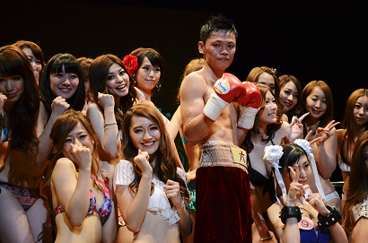 試合後に美女集団に取り囲まれ、記念撮影に応じた向井は照れ笑いも浮かべたが、いかにも幸せそう。「日本タイトルを目指します」とガッツポーズ。