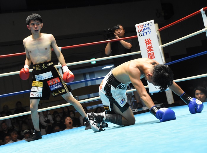 ※写真は最初のダウンをもたらした山口の右ストレートが挑戦者のアゴに命中した瞬間