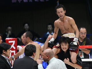 ※写真上は大和心トレーナーの肩車の上で喜ぶ新チャンピオン。下は右フックでエスキベルを攻める山中