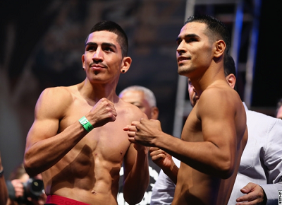 同じリングで行われるWBC世界S・バンタム級タイトルマッチは王者レオ・サンタクルス(メキシコ=米)が121ポンド(54.88キロ)、挑戦者マヌエル・ローマン(メキシコ=米)がリミットの122ポンド(55.34キロ)だった。同じくIBF世界ライト級戦は王者ミゲール・バスケス(メキシコ)がリミットの135ポンド(61.23キロ)、挑戦者でメイウェザー・チームの1人ミッキー・ベイ(米)は134ポンド1/2(61.01キロ)をマーク。