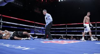 なおこの日の前座では他にも帝拳ジムの2選手がリングに上がり、白星を飾っている。日本S・ミドル級1位の三浦広光はエクトール・エルナンデス(米)と6ラウンドの熱闘を乗り切って3-0判定勝ち。体格で劣る三浦だったが、左フック、右クロスで懸命に攻め、ポイントをあげた。三浦は8勝3KOと不敗を維持。同じく日本ミドル級1位のカーロス・リナレスはケビン・ライディング・イン(米)に初回75秒KO勝ち。左フックで倒した後、追撃してレフェリー・ストップに持ち込んだ。※写真上はゴンサレスのKOシーン、下はライディング・インを沈めたリナレス =PHOTOS/SUMIO YAMADA=