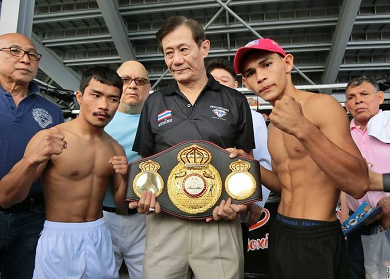 1日タイのブリアムで挙行されるWBAミニマム級暫定王座決定戦の計量が前日行われ、WBA5位カルロス“チョコロンシート”ブイトラゴ(ニカラグア=WBO1位)、WBA6位ノックアウト・CPフレッシュマート(タイ)ともリミットの105ポンド(47.63キロ)を計測した。