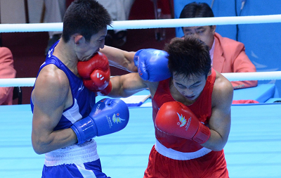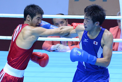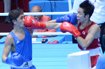 ロンドン五輪銅メダリストの清水は、実戦は五輪以降今回が初めてだったが、ブランクの影響もさほどなく、この日もドルジニャンブ(モンゴル)相手に長い左ジャブを的確に決め、左ストレートのカウンターも決まり快調にスタートを切った。その後も左強打を浴びせて、しかし採点は意外に厳しく初回から3回まで毎回9-10で取られていた。 左のショートを決める川内(左)