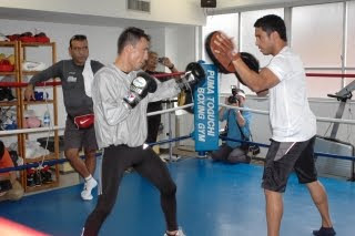 31日、日本武道館で清水智信(金子)の挑戦を受けるWBA世界S・フライ級チャンピオン、ウーゴ・カサレス(メキシコ)が今日午後、ピューマ渡久地ジムで公開トレーニングを行った。 シャドー、サンドバッグ打ち、ミット打ちにロープと軽めながら一通りの練習を行った王者は練習後、着ていたシャツを絞ると水道の蛇口をひねったかのように汗が滴り落ちた。