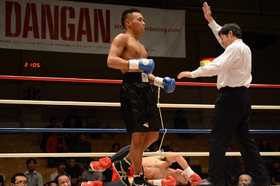27日の後楽園ホールはこれが3度目となるC級トーナメント1回戦(REASON主催)。出場資格が戦績「2勝以内」で、S・バンタム級からS・ライト級(ライト級を除く)までの4回戦10組が行われた。 豪快にKO勝利を決めたポンタ