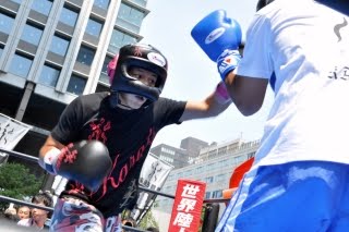 31日日本武道館でダブル世界タイトル戦のリングに立つ亀田興毅と清水智信が17日、東京・大手町の野外特設リングでファンの前でスパーリングを公開した。