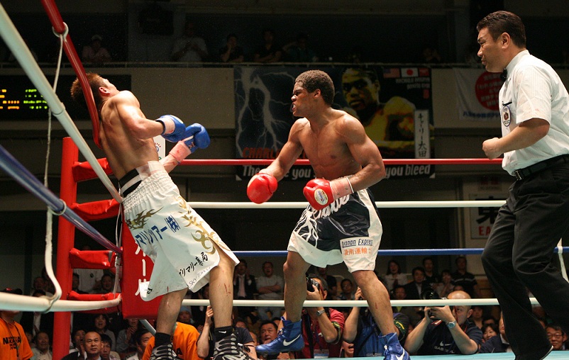 ※写真は8回終了間際、チャーリーの右を受けてロープにもたれかかる湯場