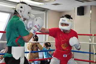 トレーニングに先立ち行われた会見では「前回(ムンロー戦)ではサウスポー相手に右リードを出すよう練習しましたが、今回は右相手であっても右を出していきたい」。発言どおり、松田直樹とのスパーでも右ジャブを攻撃に防御にと繰り出し、調整の順調さをうかがわせた。試合に備えたスパーリングは100ラウンドを超えたという。