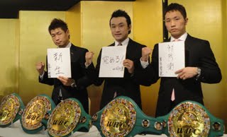 ※写真はグリーンのWBCベルトとともに勢ぞろいした3王者。決意を記した色紙には、「新生」(長谷川)、「究める!」(西岡)、「初防衛」(粟生)と書かれていた