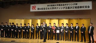 12月の第64回全日本大学王座決定戦で関西大学を8-3で下し7度目の優勝を飾った東京農業大学ボクシング部(山本浩二監督、小泉幸道部長)の祝賀パーティーが30日昼、東京・新宿のホテルに出席者約300名を集めて賑やかに催された。=写真=