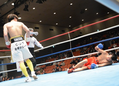 パンチに自信のある両者はともにスタートから思い切りよく手を出した。ラウンド終盤、炸裂したのは溜田の鮮やかな右カウンター。大橋がグニャリと崩れ落ち、主審はノーカウントでストップした。溜田は11勝9KO1敗2分。大橋は11勝7KO4敗1分。