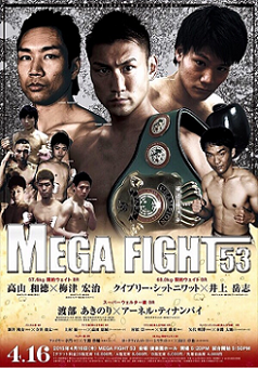 4月16日(木)東京・後楽園ホールで行われる「MEGA FIGHT53」のチケットを5組10名さまにプレゼントします(野口ジム提供)。