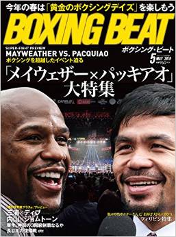 ボクシング・ビート5月号がきょう15日発売となりました。今月号のキャッチフレーズは「今年の春は『黄金のボクシングデイズ』を楽しもう」です。巻頭を飾るのはもちろん5月2日(日本時間3日)に行われるメイウェザーvsパッキャオの大特集。表紙にも世紀の対決に挑む両雄の顔をドカンと並べました。