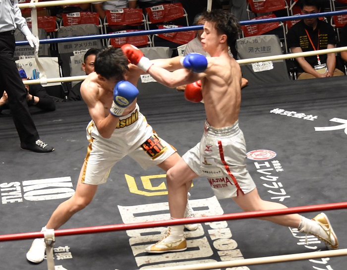 序盤、宮森は軽快なフットワークで左へ回り込み、右アッパー、右ストレートさらに左ボディーブローで迎撃。鄭の前進に対して素早い攻防の切り替えで着実にポイントを奪った。しかし鄭のプレッシャーは衰えることを知らず、豊富なスタミナを武器にぐいぐい宮森に迫る。ラウンドを重ねると宮森がつかまるシーンが増え形勢逆転。宮森は鄭の気迫と前進にさらされながらもていねいな対応を見せていたが、終盤は乱戦に巻き込まれて右を幾度となく打ち抜かれてフラフラ。最終回、宮森はステップを切り替えて前進したが鄭の圧力を押し戻すまでにはいかずにゴングを聞いた。序盤は宮森、後半は鄭とペースがはっきり別れた試合の裁定は96-94、96-95、95-97で宮森の勝ち。鄭は5回バッティングで減点されたのが響いた。東洋ランク入りを確実(鄭はS・フライ級2位)にして宮森は11勝3敗1分。体力面の強化でさらに伸びそう。