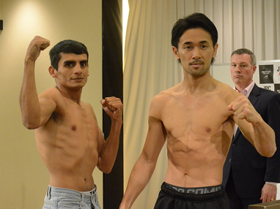 はかりの上でポーズの寿以輝 山中は「これから麺類を食べ、夜はうなぎでも食べます。相手も調子がよさそうなのでいい試合になるでしょう」と余裕のコメント。サンティリャンも「計画的に減量してきて、いい結果がでた。よい試合になるでしょう」と笑顔を絶やさなかった。