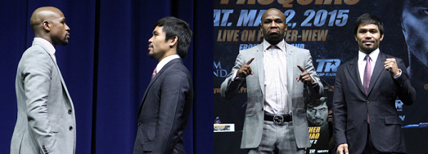 ロサンゼルスのダウンタウン、スポーツの殿堂ステープルズ・センターの向かい側にあるノキア・シアター。普段はコンサートやトークショーなどショービジネスで使用される会場がメディア関係者で埋め尽くされた。3月11日午後2時、シックなスーツ姿のパッキャオが先に入場。続いて今回が世界タイトル戦35戦のメイウェザーが、これも淡い色のスーツに身を包んで登場。スーパーファイトの一度きりのプレス・カンファレンス(記者発表会)が開始された。