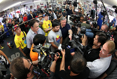 5月2日(日本時間3日)米ラスベガスのMGMグランド・ガーデン・アリーナで、フロイド・メイウェザー(米)との大一番に挑む世界6階級制覇王者マニー・パッキャオ(フィリピン)が15日、拠点とするロサンゼルスのワイルドカードジムでメディアに練習を公開。300人の報道陣でジムがあふれかえった。