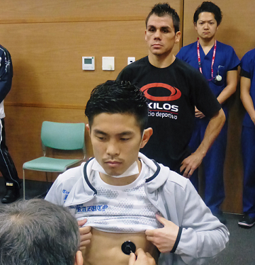 検診を終えた井岡は「(フライ級王座挑戦して敗れた)前回から試行錯誤しながら練習を積んできた。リングで戦ってみないとわからないが、万全にきているし、試合を楽しみにしています」と余裕の表情。王者レベコとは身長で8.3センチ、リーチで4.2センチ上回っている。井岡一法会長は「どちらが強いかを決めるだけ。100%いい試合になる」と期待を表した。レベコは「コンディションは120%の出来だ。いい挑戦者を迎えることができ、12ラウンド戦い抜く準備はしてきた。背が低い方なので身長、リーチ差は慣れている」と話し、胸に入れた名前と守り神のタトゥーを誇示した。