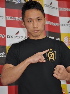 午後3時から練習した粟生は、「リラックスしていながらいい緊張感がある。自分から仕掛けるが、バランス重視。相手は何かが突出しているわけではないが、すべてが平均点以上でスキがない。上手い選手なので攻防一体を念頭に練習してきた」と語った。その表情は粟生自身がいうようにリラックスしたもの。減量苦から開放されて「以前は最後シンドくて減量のための練習になっていたが、いまは元気、強くなるための練習ができている」と手応え十分。そして「いま中日ドラゴンズ、名古屋グランパスと優勝してのっている。グランパスは僕の高校時代の先輩・玉田さんが決勝ゴールを決めて縁を感じる。僕も決めます」と抱負を語った。写真は今回の世界戦仕様Tシャツをまとった粟生。バックにこれまでの勝ち星19個の☆がプリントされ、胸にもう一つ。20個目の白星は2階級制覇となる。