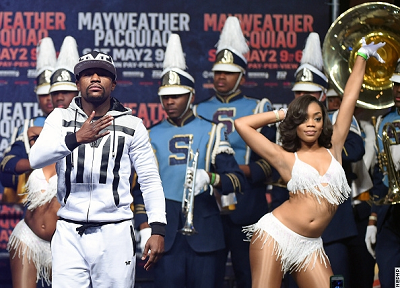 メイウェザーはマーチングバンドに先導されてド派手に会場入り。「支えてくれる人々に感謝している。スマートに戦う」と決意表明をした。