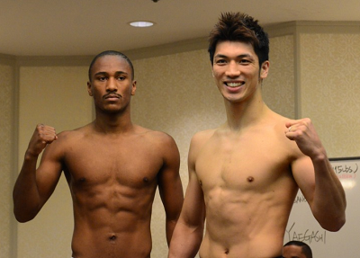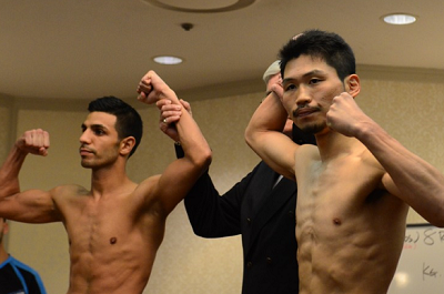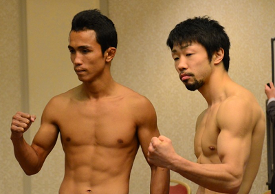 再起戦のリングに立つ前WBCフライ級王者の八重樫東(大橋)は相手のソンセーンレックともども52.1キロでパス。S・フライ級での再出発にあたり、まずは第一関門を突破した。