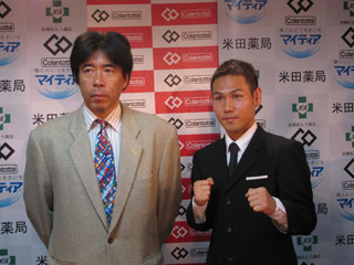 高山が全勝のIBF王者に挑戦―。ミニマム級で過去にWBC、WBA暫定と世界王座を獲得した高山勝成(27)が、今月27日に南アフリカでIBF同級王者ヌコシナチ・ジョイ(27=南アフリカ)に挑戦することが正式決定した。8日、大阪市内の会見で発表された。=写真は高山と中出トレーナー=