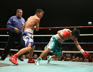 6日夜後楽園ホールで行われたダブル東洋太平洋タイトルマッチは、フェザー級松田直樹、S・ライト級佐々木基樹の帝拳ジムのチャンピオン・コンビが明暗を分けた。松田は、同級11位ジョネル・アリビオ(比国)とダウン応酬の末、6回に右をカウンターされて痛烈ダウン。タオル投入のTKO負けで王座転落となった。一方S・ライト級戦は、佐々木が同級12位ゲイスラーAP(インドネシア)の挑戦を7回1分7秒KOで撃退し、7月にランディ・スイコから獲得したタイトルの初防衛に成功した。 松田は初回偶然のバッティングで左眉をザックリ割られ出血し、以後流血に苦しめられた。2回にアリビオの右強打を打ちおろされてダウン。3回には逆に右を決めてカウントのお返し。その後も流血に苦しみながらの試合が続く。ペースを掴みかけたのも束の間、6回に右をカウンターされて痛烈なダウン。カウント途中でタオルが入り、この回55秒TKOで松田の腰からベルトが失われた。「自分が弱かっただけ。粟生とか世界戦を控えているのに、俺が(帝拳ジムの)勢いを止めちゃって申し訳ない」と、松田は自らの敗北がジムの同僚に影響しないかと気遣っていた。