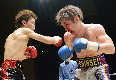 ハードパンチャーの田淵は2回終了直前に右ストレートをヒットしてあっさりダウンを奪った。一方的な試合になると思われたが、サウスポーの東は右ジャブを効果的に使い、田淵の接近を阻む。3回に田淵が不用意に出たところに右フックをカウンターで決めてダウンを奪い返した。しかし、パンチの破壊力は田淵が上回り、4回に東が左目上をカット、また鼻血も出るなど、流血の試合に。5、6回と田淵のパンチがヒット、7回はフットワークが衰えた東が真っ直ぐ下がってロープを背負ったところに、田淵が右ストレートから連打を浴びせた。防戦一途の東の動きを見て主審が試合を止めた。田淵はパンチを過信する余り、攻めが単調になるきらいがあり、細かい動きからの連打を放つのが今後の課題だ。