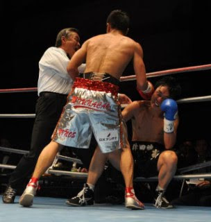 互いに右リードを差しあう初回を経て試合は2回からヒートアップ。ツニャカオのクイックな左クロス、右フックが目立ち始め、3回に本田は返しの右フックでグラリ。4回こそ先手で仕掛けて立てなおしを図った本田だが、迎えた5回またもツニャカオの右フックを被弾。ここで一気に王者が連打を見舞うと宮崎主審がストップした。
