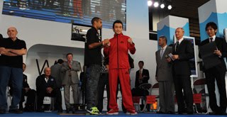 出場選手らは23日午後、東京ミッドタウンで公開計量に臨み、それぞれ規定ラウンド内で最後の難関をパスしている。西岡は54.8キロとリミットを500グラム下回り、ムンローは54.5キロとこちらは800グラム・アンダー。写真は計量を終えてポーズをとる西岡とムンロー。