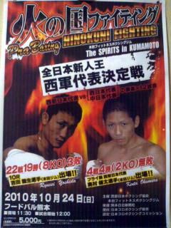 全日本新人王の西軍代表決定戦は10月24日熊本市の「フードパル熊本」で行われる。西部日本(九州・中国)の新人王が中日本×西日本対抗の勝者たちと激突する。ただし、12階級のうちフェザー級は岡島広和(オール)が骨折して棄権を申し出たため、知念健太(沖縄ワールドリング)の不戦勝となっている。