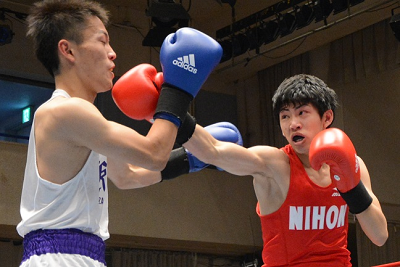 アマチュアボクシングの第68回関東大学ボクシングリーグ戦が23日後楽園ホールであり、第2週目のこの日は、1、2部とも3試合ずつが行われた。1部は前年優勝の日本大学が同5位の駒澤大学に7-2と快勝。同じく前年2位の東京農業大学は4位の東洋大学にきわどく5-4の勝ち。この日大、東農大2校のみが不敗を維持している。 日大は期待の村田(右)らの活躍で勝利