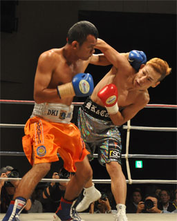 同じく再起戦のリングとなった前日本バンタム級チャンピオンの安田幹男はラファエル・パンガリヴァン(インドネシア)を初回KO。立ち上がり、右ストレートから返しの左ボディーを炸裂させた安田。たまらず倒れたパンガリヴァンは立ち上がったが、すぐさま2度目のダウンを奪われ、10カウントを数えられた。=写真下=