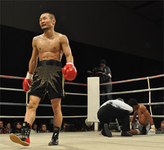 11日、大阪市住吉区民センターで行われた六島ジムの興行「六島四天王」には同ジムの看板選手4人が出場。メインを張った前WBA世界Sフライ級王者の名城信男はインドネシアSバンタム級4位イワン・キーに3回1分42秒KO勝ちした。=写真上=