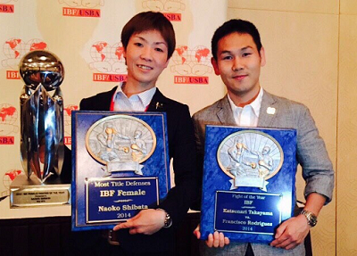 ■IBF女子世界L・フライ級王者の柴田直子(ワールドS)とIBF世界ミニマム級王者の高山勝成(仲里)が先ごろカナダのモントリオールで開かれたIBF総会で表彰された。柴田は日本人として初の女子MVPに選ばれ、高山は昨年8月のフランシスコ・ロドリゲス(メキシコ)とのIBF・WBO統一戦が、敗れながらも年間最高試合に輝いた。柴田は英語で受賞スピーチをして喝采を浴びた。