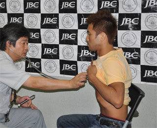 先に診断を終えた大毅は懸念される減量苦と“只今格闘中”とあって言葉少な。「もう練習は終わった。あとは体重だけ。(減量の調子は)まあまあかな」。「(試合に向けて節制しつつ備えるというのは)練習がおろそかになると思う。俺は先週木曜日まで普通どおりにご飯を食べて動いた」と、試合直前に一気に体重を落とす調整方法について語った(上写真)。